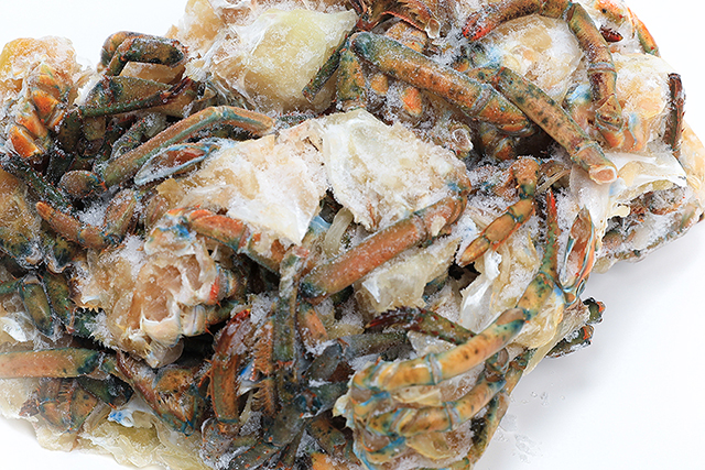 オマールの頭だけを集めた商品で、出汁を取ってソースを作るのに最適です。鬼殻とエラを除去し中身のみを四つ切りにしているので、面倒な下処理の手間を省くことができます。