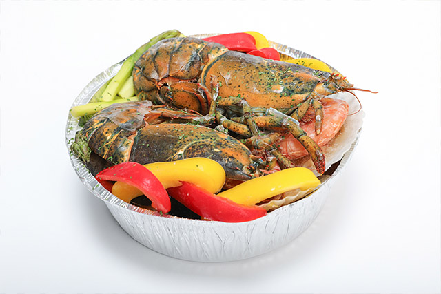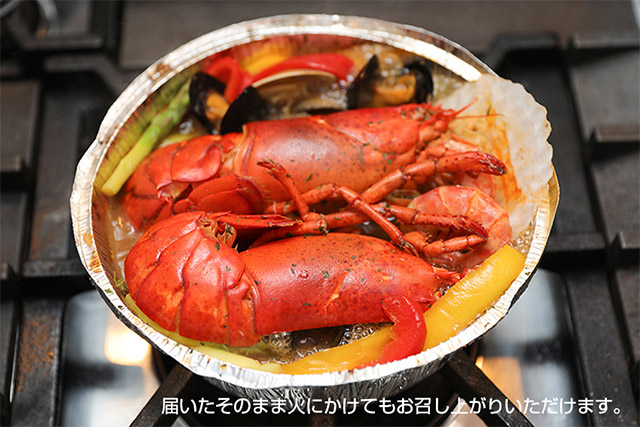 内容:活オマール1尾(半身×2)、片貝ホタテ、ムール貝、はまぐり、アルゼンチン赤海老、アサリ、赤パプリカ、黄パプリカ、グリーンアスパラ