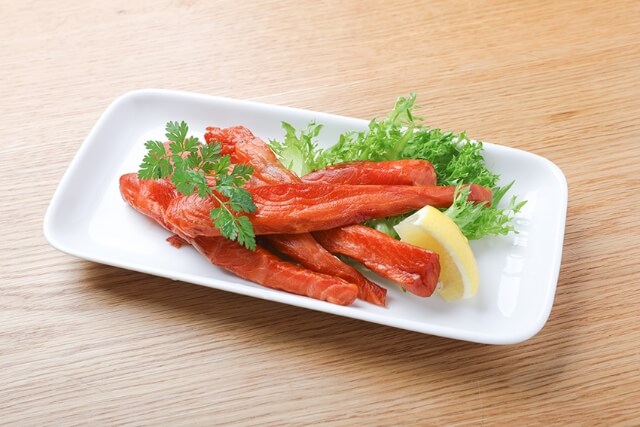 脂乗りの良いキングサーモンだけを100%使用したスモークサーモンジャーキーです。燻製の香り豊かな肉厚のジャーキーは、お酒のおつまみにぴったりです。そのままお召し上がりいただけます。