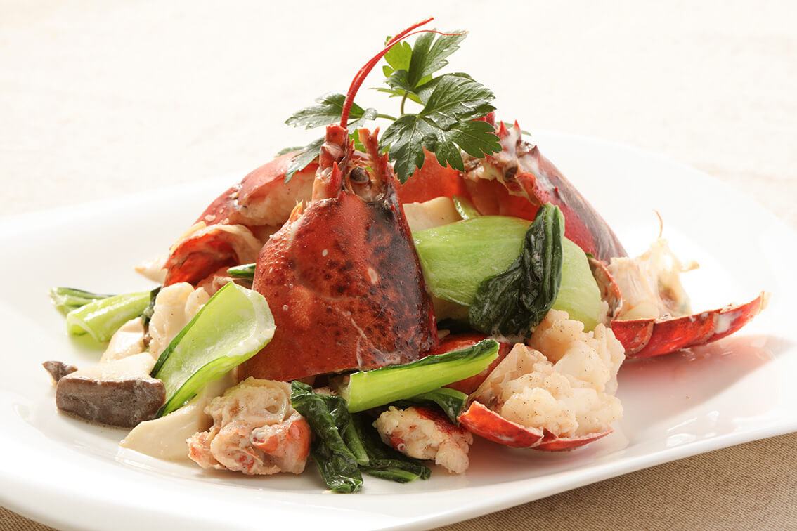 サラダ油に刻んだニンニク、生姜を入れ、塩胡椒で下味をつけたオマールと一緒に炒めます。